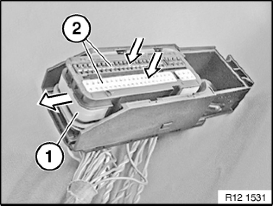Unlock tab (1), pull contact carrier (2) in direction of arrow out of housing.