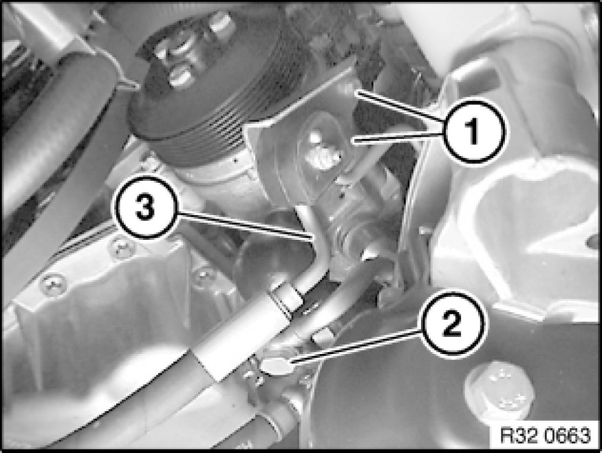 Remove Dynamic Drive pressure line (3) with bracket from power steering pump and lay to one side.