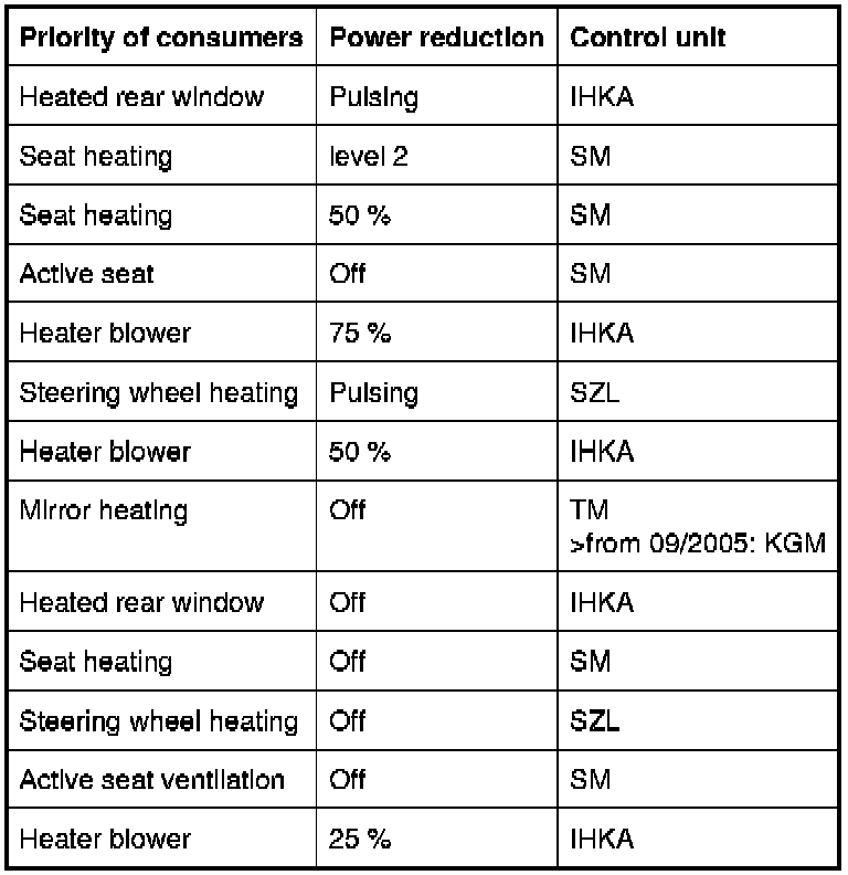 The auxiliary consumers listed can still be switched on after the engine has been switched off. The auxiliary consumers are automatically switched off when the battery reaches its limit of starting capability. A CAN message from the DME/DDE prompts the shutdown.