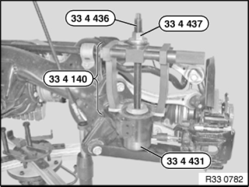 Using the special tools 33 4 436, 33 4 437, 33 4 140 and 33 4 431, pull rubber mount out of bearing bush.