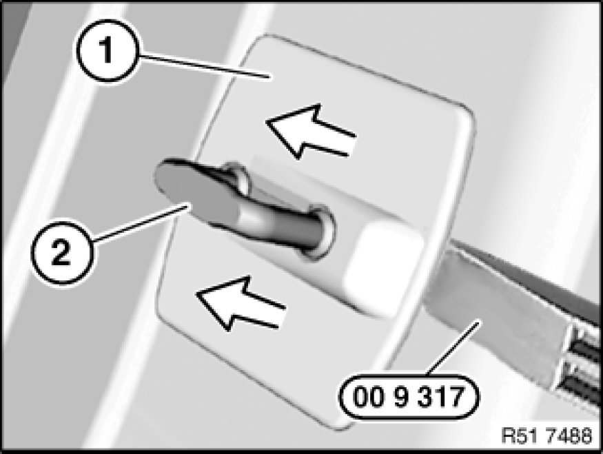 Unclip cover (1) with special tool 00 9 317 00 9 317 Trim Panel Wedge from door detent (2) and remove towards front.