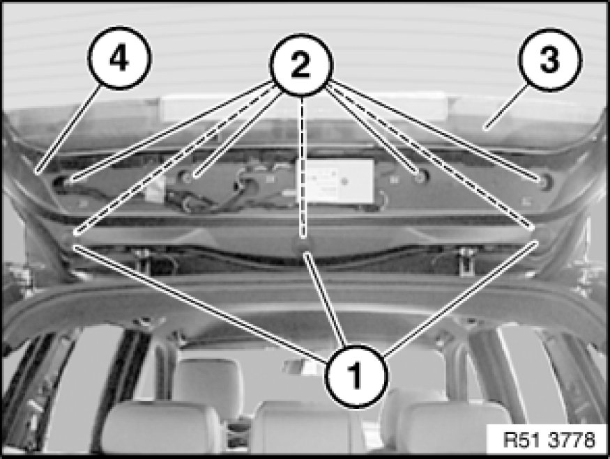 - Remove trim for rear window frame at top Removing and Installing/Replacing Trim for Rear Window Frame at Top.