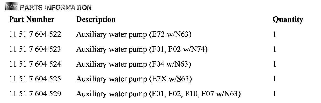Check that the electrical connector to the coolant pump is locked-in properly and that there is battery voltage at the pump. If no fault can be found with the connector or supply voltage, replace the auxiliary water pump for the turbochargers with an improved pump (refer to parts information). Refer to Repair Instruction RA11 53 090 for replacement of the pump and proper coolant bleeding procedures.