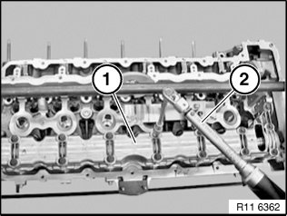 Mount special tools 11 4 461 with screw (1) to inside of cylinder head.