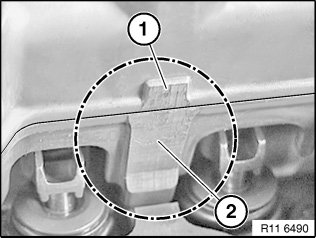 Schematic depiction of special tool 11 4 461 at lower bearing strip (1) and upper bearing strip (2).