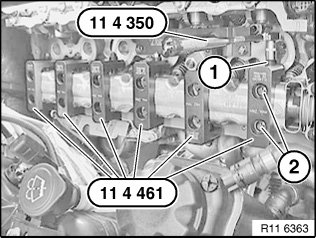 On cylinder no. 2 mount special tool 11 4 461 with screw (1) facing outwards.