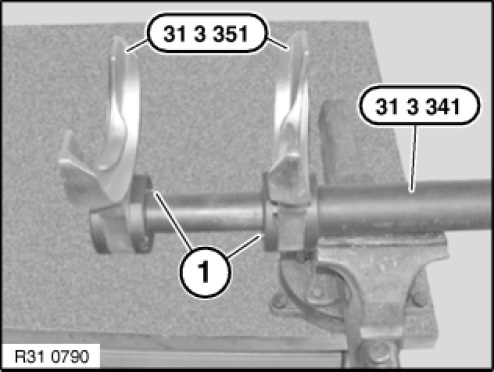 Fit special tools 31 3 351 from above on special tool 31 3 341 until retaining bolts (1) can be felt and heard to snap into place.