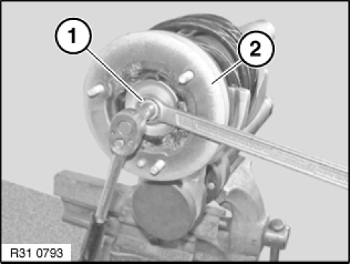 Release nut (1) (grip piston rod in so doing) and remove support bearing (2).