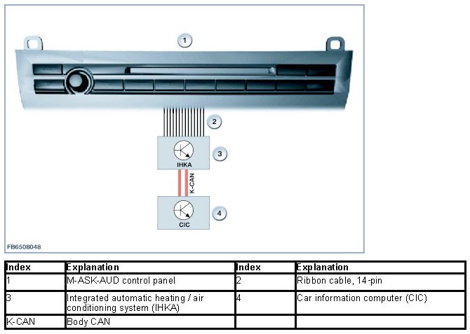 The operating unit for M-ASK-AUD with the 'favorites' buttons is not connected directly to the CIC. The operating facility is integrated in the control panel for the IHKA. The electrical connection is by means of a ribbon cable leading to the IHKA control unit. The IHKA sends the signals in messages on the K-CAN.