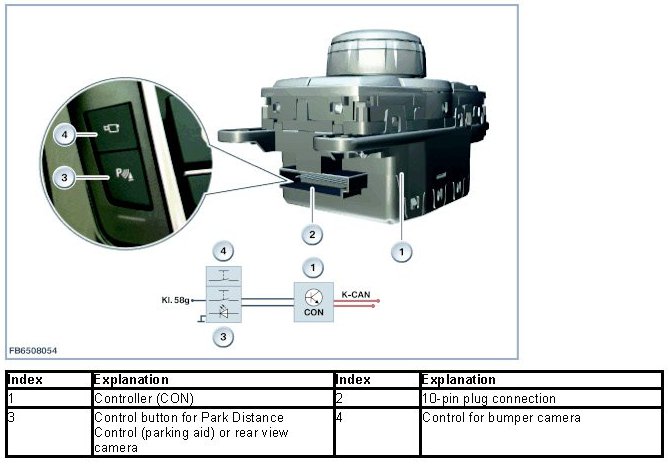 A small switch block is electrically connected at the controller. Depending on the options fitted, the switch block contains the controls for the Park Distance Control (PDC = parking aid) as well as for the bumper camera. The signals are placed by the controller (CON) on the K-CAN.