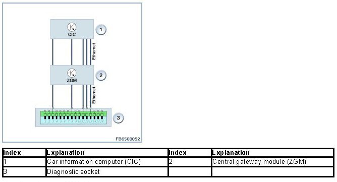 The diagnostic socket is connected to the CIC via Ethernet (5 lines). The central gateway module (ZGM) is located in between. The CIC is programmed via Ethernet.