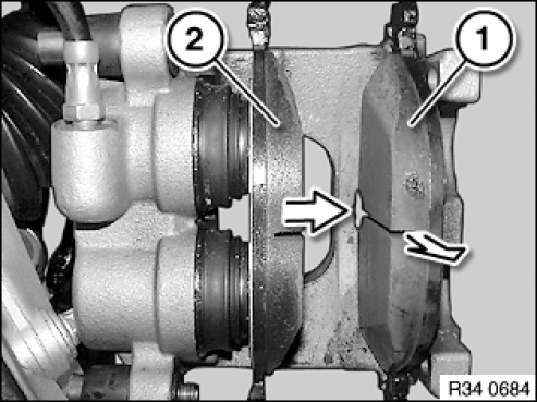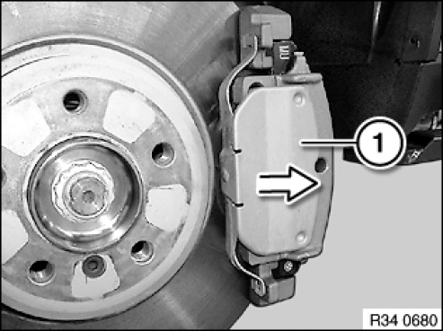 Force inner brake pad (2) in direction of arrow off piston and remove.