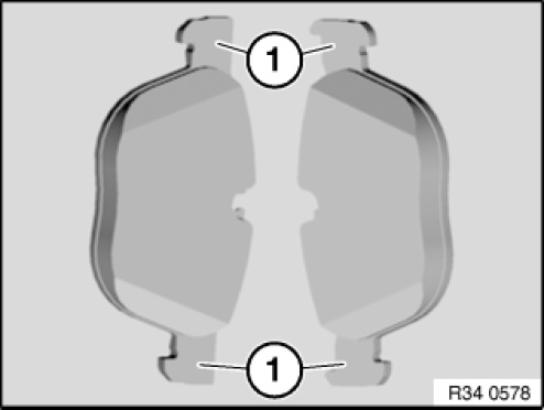 So as not to damage the surface coating, if possible do not mechanically clean pad guides (1). Instead, clean with brake cleaner and apply a thin coating of brake pad paste.