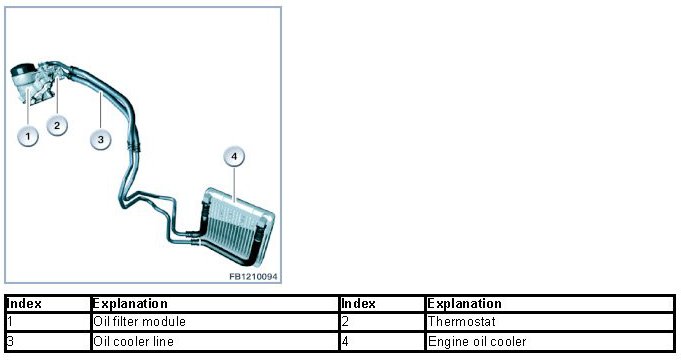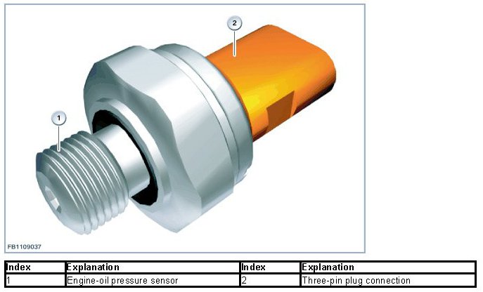 The oil pressure sensor monitors the lubricating system. The oil pressure indicator light lights up if the oil pressure does not exceed a defined value. This value is approx. 0.2 to 0.5 bar. The oil pressure sensor is connected across a signal line with the of the Digital Engine Electronics (DME). If the switch is not operated, there is a voltage of 12 Volts on this signal line; if the switch is operated, there is a voltage of 0 Volts. The data interchange is digital.