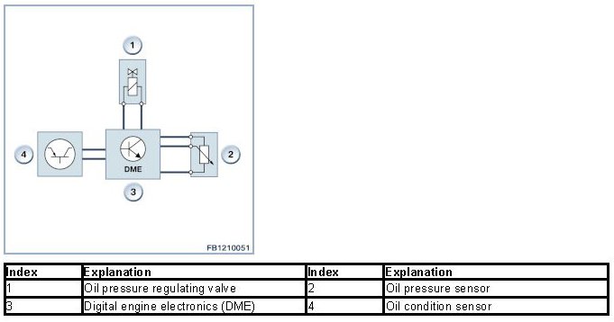 The Digital Engine Electronics (DME) evaluate these measured variables. With the oil condition sensor, the electrical properties of the engine oil are also determined. The characteristics change with wear of the engine as well as changes to the engine oil (for example, ageing, deposits).