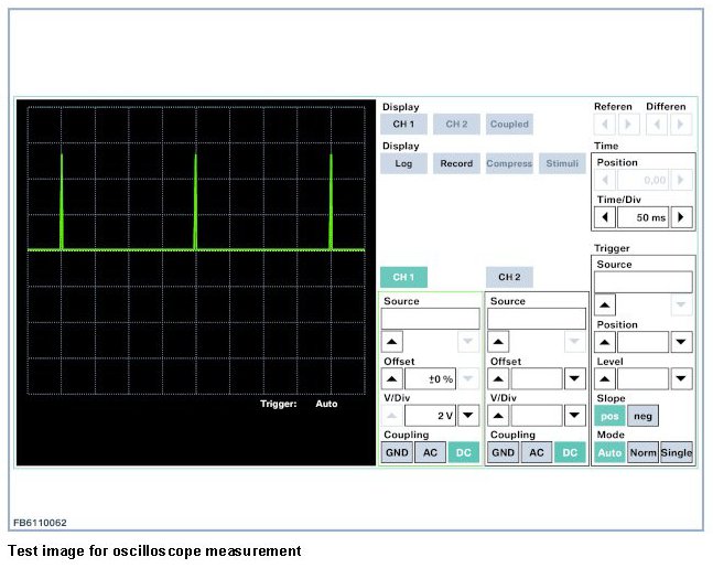 The belt buckle switches indicate whether the seat belts have been fastened or not. The belt buckle switches are supplied with clocked voltage by the airbag control unit. The following shows the voltage curve that is measured at the airbag control unit when the voltage curve is OK. For the voltage measurement, the adapter lead must not be connected to the seat belt buckle switch.