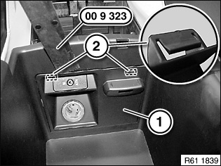 Use special tool 00 9 323 to release retaining lugs (2) and remove trim (1) from storage compartment.
