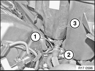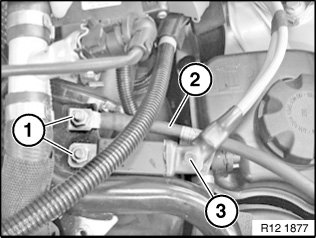 Raise coolant expansion tank (2) slightly until plug for coolant level switch and lower coolant hose are accessible. Unclip line on side of expansion tank.