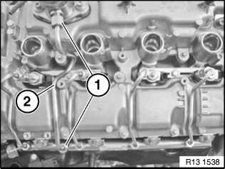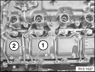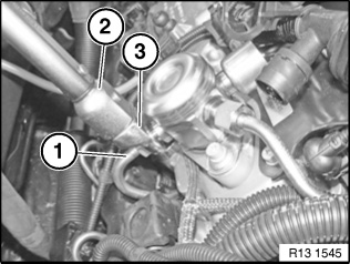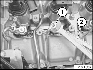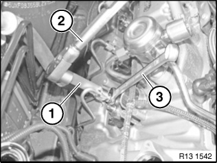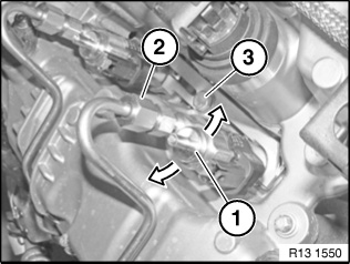 Tighten down pressure line (1) on rail to torque (2), with long wrench socket (3) SW13 and special tool 13 0 140.