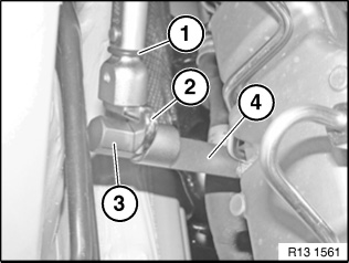 Tighten down pressure line on rail with torque wrench (1) and special tools (2) 00 1 440, (3) 13 0 162 and (4) 13 0 161.