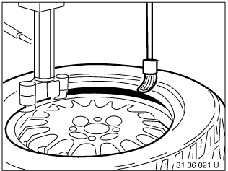 If the tyre was filled with the M-Mobility system after a puncture, it will be necessary before removal to drill an approx. 25 mm dia. hole in the side wall of the tyre. Allow sealing compound to flow out through this bore and dispose of compound in compliance with environmental regulations. Clean disc wheel after removing tyre.