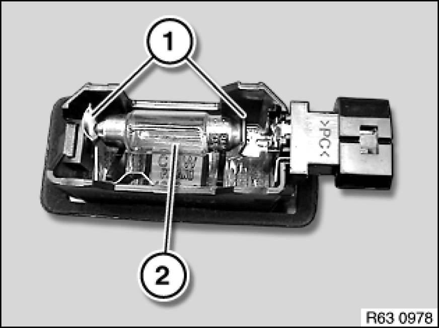 Spread bow contacts (1) outwards and remove bulb for license plate light (2).