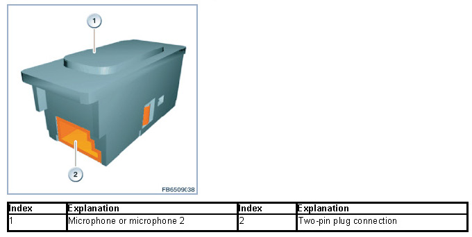 The 2 hands-free microphones (microphone and microphone 2) are installed in the outer left and right sides of the roofliner near the sun visors. The 2 microphones are used for hands-free mode during telephone operation and for voice input for the Active Voice Recognition.