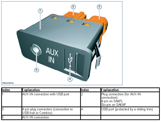 The audio socket (AUX-IN connection) can be used to connect an external audio source (e. g. MP3-or CD player) via a 3.5 mm jack plug. The unit is operated on the operating elements of the external audio source. The AUX-IN connection with USB port (SA6FL USB audio interface) is available as optional equipment. External audio sources with USB port are integrated in the vehicle's entertainment system via this USB audio interface (switched). A connection for Smartphones is offered for connection of the MP3-player in the mobile phone (SA6NF Extended connectivity of the music player in the mobile phone).