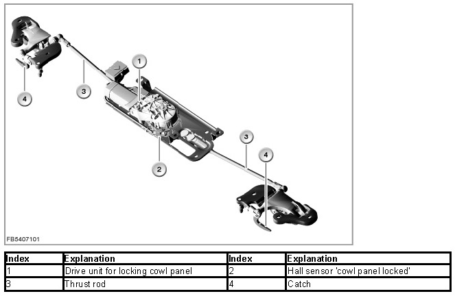 The drive is arranged in the centre. A rotating disk and thrust rods move the catches to the right and left. The Hall sensor 'cowl panel locked' monitors the interlock.