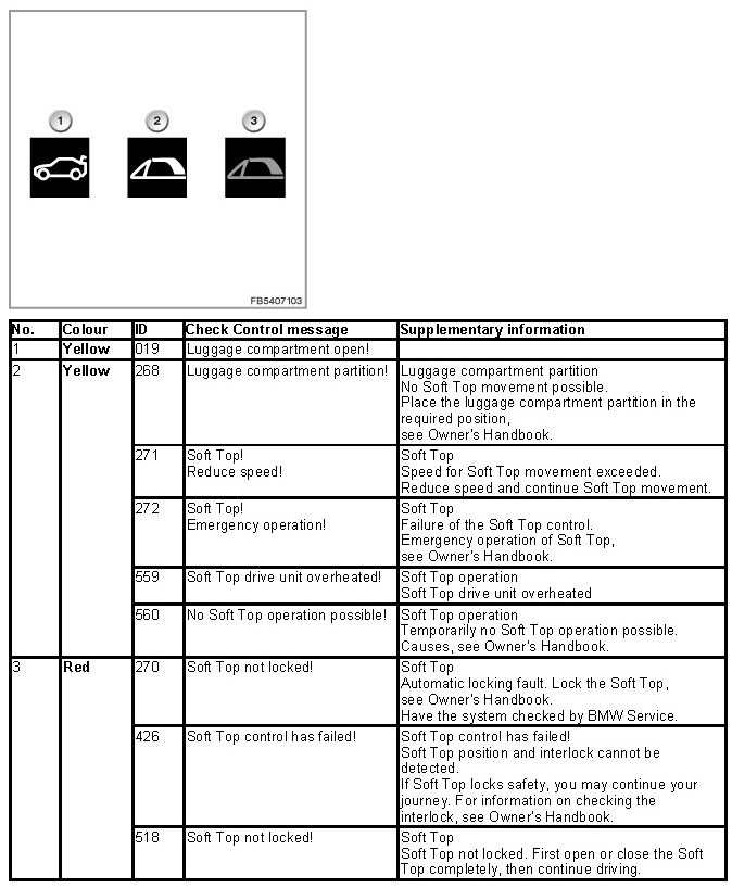 The instrument cluster displays via the Check Control messages for the Soft Top via Check Control symbol.