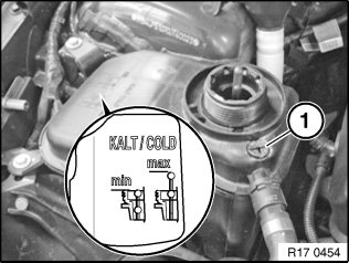 6. Then top up fill level in coolant expansion tank with 100 ml above max. (see Fig. R17 0450).