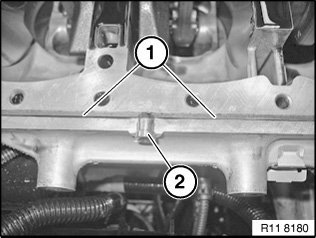 Drive both injector nozzles (1) on left and right with special tool 11 9 360 into crankcase up to stop.