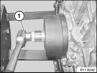 Make sure that the special tool (1) completely engages in the flywheel teeth (see arrow)
