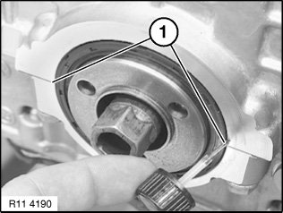 Position radial shaft seal (1) with special tool 11 8 220 on the crankshaft.