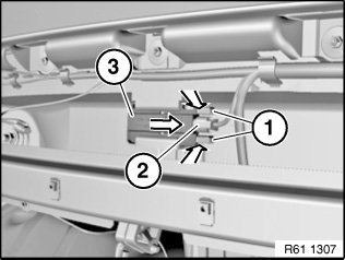 Unlock catches (1) and remove bumper antenna for comfort access system (3) in direction of arrow from holder.