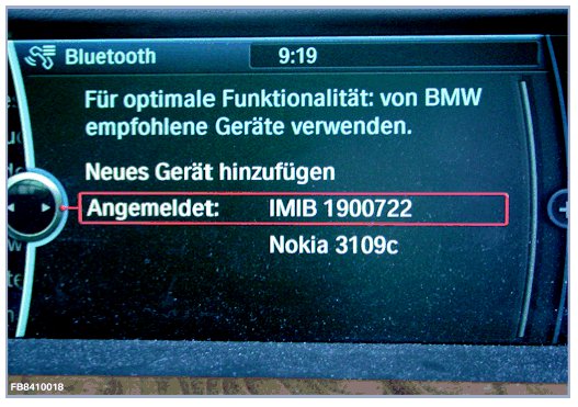 The IMIB must still be deleted as a connected Bluetooth device from the vehicle list after the Bluetooth check. Otherwise an extra Bluetooth device will be stored in the vehicle memory unnecessarily. Refer to the vehicle operating instructions for this function.