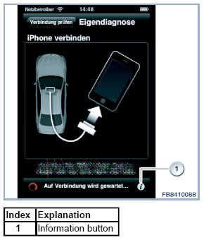 NOTE: The service employee must have special knowledge of BMW Connected in order to perform the self-diagnosis in accordance with specifications and interpret the information. The employee must be given suitable training beforehand. The BMW Connected page in the ASAP (Aftersales Assistance Portal) is available to the employee for assistance. It is also advisable to have an original Apple(TM) USB cable available for testing at the service employee's workplace.