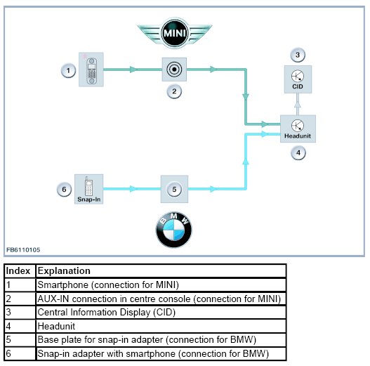 This functional description must be used for BMW and MINI vehicles. The function is identical for both brands. Only the smartphone connection is different. The video connection for the BMW is integrated in the base plate and must be connected with the smartphone via a corresponding snap-in adapter. For the MINI the smartphone is connected via a special MINI Y-cable to the USB and AUX-IN connection in the centre console.