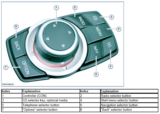 The headunit is the central control unit for the listed applications. For the purposes of picture signal transmission, the headunit is linked to the Central Information Display (CID). The headunit is also connected to the controller (CON). The controller (CON) is the control panel of the central information display (CID).
