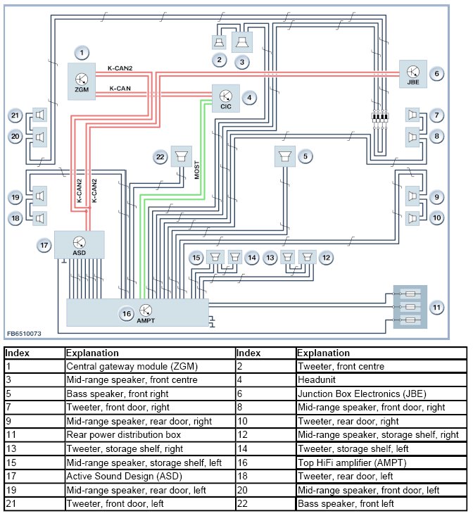The audio amplifier is connected to "terminal 30" and GND for voltage supply. The audio amplifier is woken up using the MOST bus. The audio amplifier is active under the following preconditions: