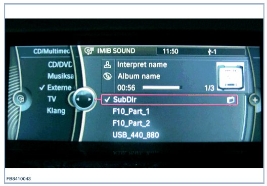 IMIB SOUND must be selected via the controller in order to display and play the music files. Check volume control in vehicle. A total of 3 media files and a sub-directory (SUBDIR) with contents are offered. To find the subdirectory, select IMIB SOUND and then select Browse directories. In vehicle with a Combox, album cover information is displayed in the form of a graphic as well as the media descriptions (genre, album and track).