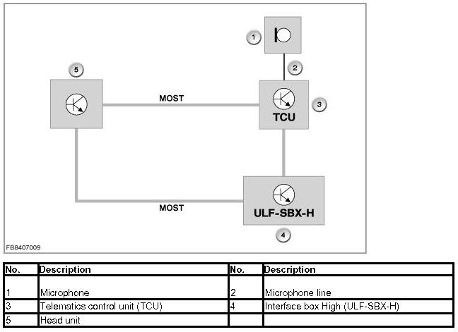 If there is a parallel installation of Telematic Control Unit (TCU) and ULF-SBX-H in the vehicle, the vehicle microphone is connected to the TCU. All telephone functions are implemented via the TCU. The ULF-SBX-H provides the voice recognition system as well as other functions (depending on vehicle equipment). Diagnosis of the vehicle microphone is implemented within the framework diagnosis of the TCU.
