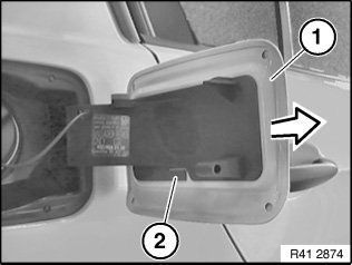 Lever out lock (2) and detach fuel filler flap (1) in direction of arrow.