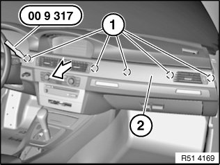 Lever out decorative strip (2) from left side beginning at retaining points (1) with special tool 00 9 317.