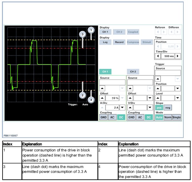 For evaluation of the characteristic curve, the measured power consumption of the central locking drive must be examined in block operation. The power consumption in block operation must not exceed 3.3 A.
