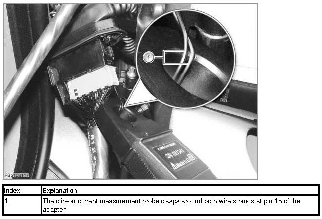Synchronizing the 100A clip-on current measurement probe. During the adjustment, the clip-on current measurement probe must not clasp around any strands of wire. The adjustment must be carried out for each individual door lock.