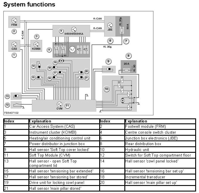 The Car Access System (CAS) controls convenience opening of the Soft Top. The signals from the remote control are received by the FBD receiver and forwarded to the CAS.
