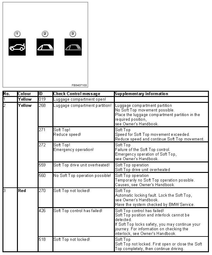 The instrument cluster displays via the Check Control messages for the Soft Top via Check Control symbol.