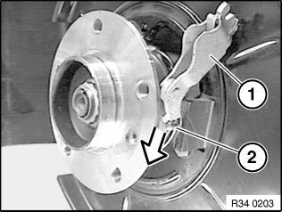 Pull brake shoe expander (1) forward, disconnect parking brake Bowden cable (2) and remove brake shoe expander.