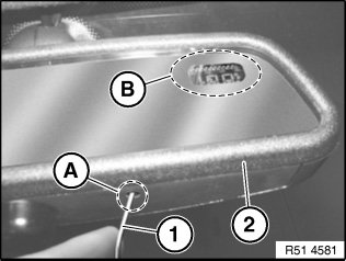 - Using a suitable tool (1), press push-button in area (A) of mirror (2) until a number appears in compass display (B)